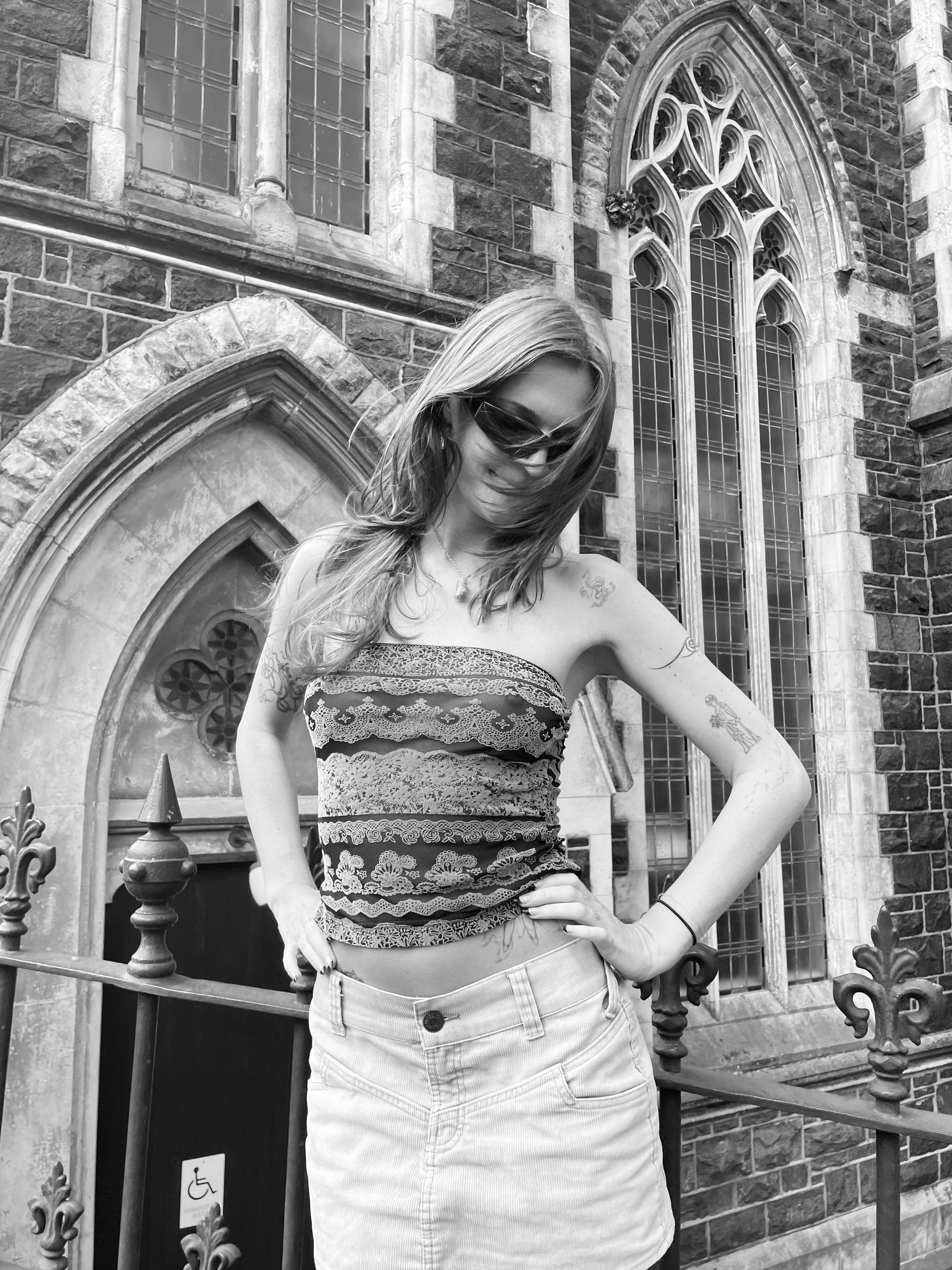 Black mesh tube top with grey velour lace print finished with picot elastic trim.